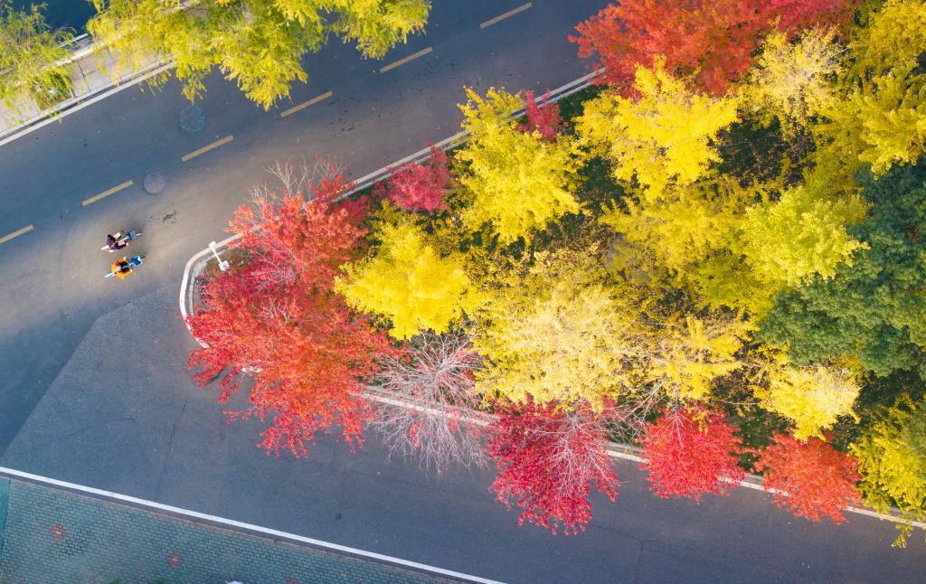 這組《秋日三疊》,是我們為秋天提交的一份層次豐富的答卷。首章,是流動的詩。高空俯瞰,紅黃交織的樹冠為街道披上秋衣,兩名騎行者穿梭于暖柔的光影中,仿佛律動的音符,奏響了季節的交響序曲。次章,是靜默的思。銀杏樹下,金黃浸染天地,少年獨自沉浸在書頁里。此刻,飄落的葉與翻動的書頁私語,構成了一個內外豐盈的寧靜宇宙。終章,是溫暖的光。同樣的金杏覆頂,成為一家人的閑適背景。懷抱的幼童、蹲下的身影,在秋景的包裹中,定格了比陽光更暖的親情瞬間。