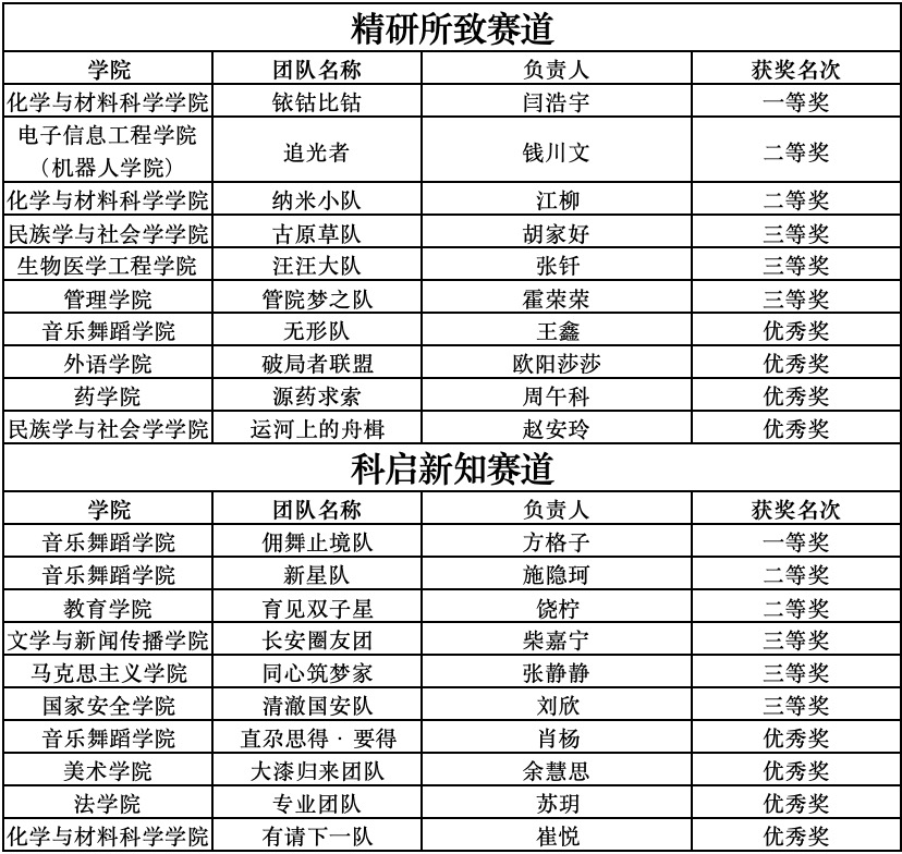 經評委綜合評審,本次大賽評選出一等獎2項、二等獎4項、三等獎6項及優秀獎8項。化學與材料科學學院“銥鉆比鉆”團隊、音樂舞蹈學院“俑舞止境隊”分別斬獲“精研所致”賽道和“科啟新知”賽道一等獎。