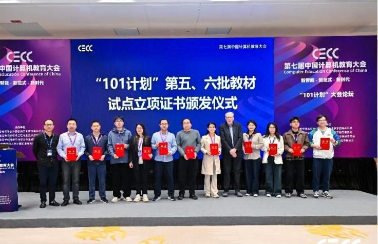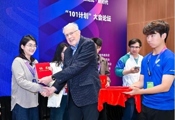 證書頒發儀式上,著名計算機科學家、圖靈獎得主約翰·霍普克羅夫特(John Hopcroft)教授為獲批項目代表頒發證書。楊波老師作為我校入選該項目的負責人,現場接受了由霍普克羅夫特教授親自頒發的立項證書,標志著我校在“101計劃”教材建設與教學改革方面取得新進展,為教材推廣與教學實踐奠定了基礎。