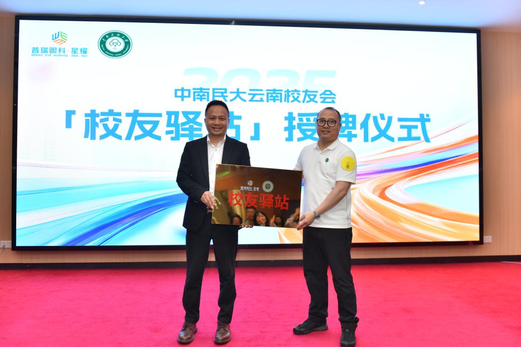 參觀結(jié)束后,校友們回到院區(qū)一樓大廳,共同拍攝了活動(dòng)的首張合照。隨后,中南民族大學(xué)云南校友會(huì) “校友驛站” 授牌儀式在會(huì)客廳隆重舉行。云南校友會(huì)副會(huì)長、2002 級計(jì)科學(xué)院校友許志碧將 “校友驛站”牌匾授予楊發(fā)達(dá)院長,標(biāo)志著 “校友驛站” 正式落戶普瑞眼科星耀院區(qū)。普瑞眼科星耀院區(qū)還為校友們提供了一系列專屬福利。授牌儀式后,楊發(fā)達(dá)院長表達(dá)了對校友們到訪的誠摯感謝,并送上美好祝福。