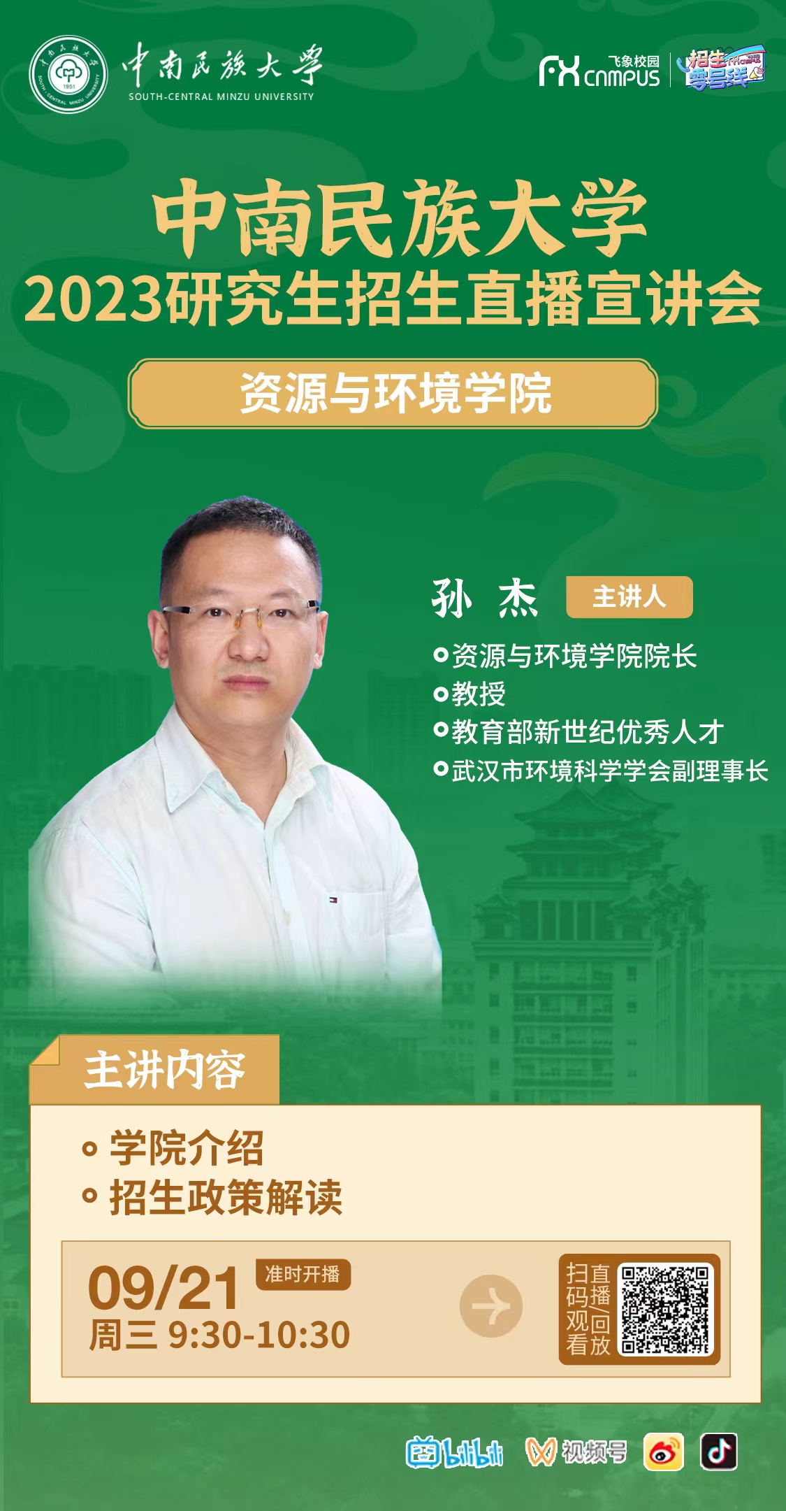 中南民族大學(xué)2023年研究生招生線上系列宣講會之六------資源與環(huán)境學(xué)院專場(9月21日 9:30)
