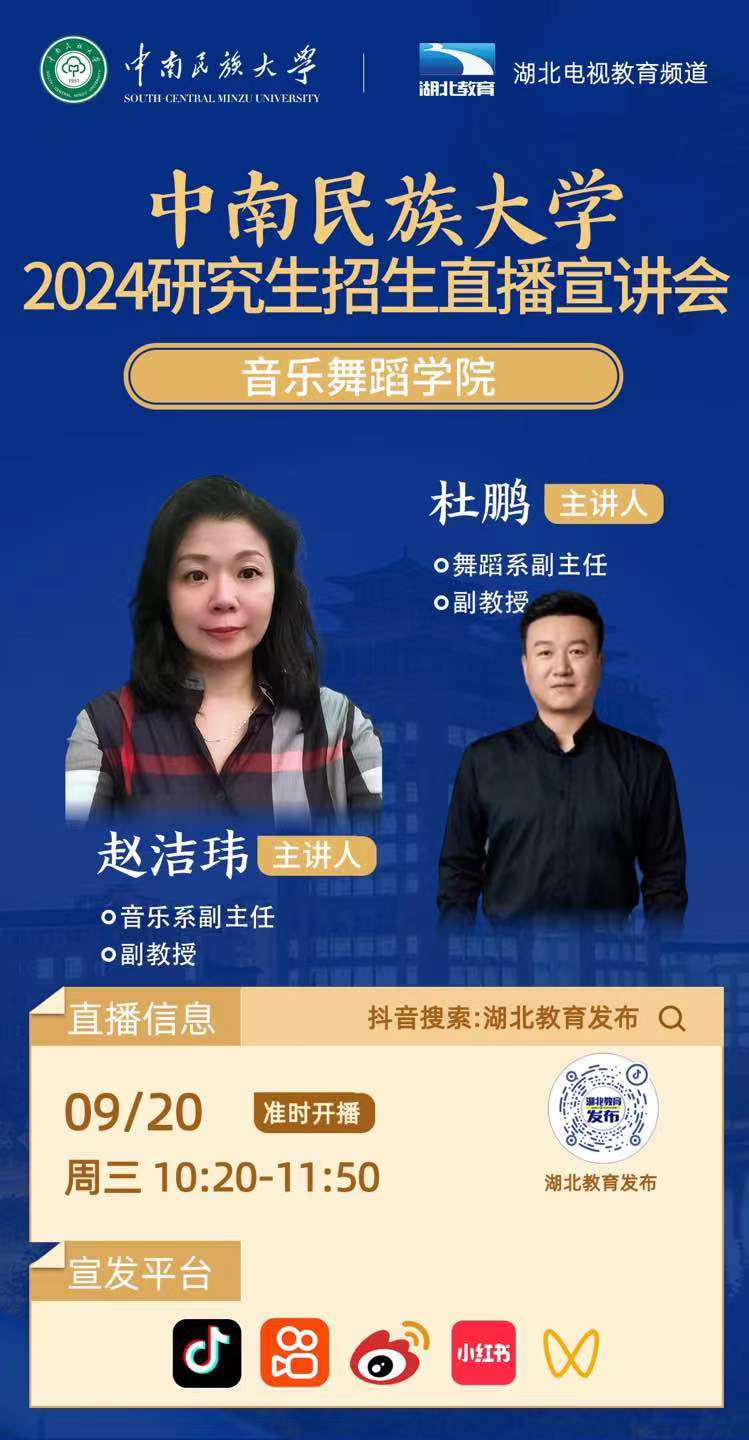中南民族大學(xué)2024年研究生招生線上系列宣講會(huì)之八------音樂(lè)舞蹈學(xué)院專場(chǎng)(9月20日 10:20)