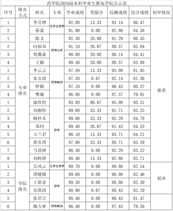 根據《中南民族大學推薦優秀應屆本科畢業生免試攻讀碩士學位研究生遴選辦法(修訂)》(民大教學〔2016〕12號)《關于做好推薦2024屆優秀本科畢業生免試攻讀碩士學位研究生工作的通知》《藥學院推薦2024屆優秀本科畢業生免試攻讀碩士學位研究生工作實施細則》等文件精神,經過報名資格審查、學業成績核算、獎勵加分認定、綜合測評考核等環節工作,經研究決定,現將藥學院2024屆本科生推免結果公示如下: