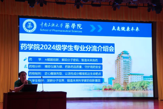 為幫助學生深入了解學科特色及專業分流政策,合理規劃學業發展路徑,4月27日,藥學院在學術會堂召開2024級學生專業分流介紹會。學院黨委副書記吳孔勇、藥學系主任王強、藥物制劑系主任胡燕、化學生物學系主任黃蓉、藥物分析系教師陳亨業出席會議。會議由2024級本科生輔導員薛光洋主持。