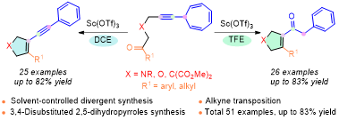 我院楊金明教授課題組設計、合成了一類新穎的1,5-炔基環(huán)庚三烯酮類底物,通過路易斯酸催化進行分子內(nèi)環(huán)化反應,成功合成了一系列2,5-二氫吡咯類化合物。反應具有良好的底物普適性,通過改變?nèi)軇l件,可以選擇性地合成不同官能團化的2,5-二氫吡咯化合物(圖2)。此外,該反應也能夠以克級規(guī)模放大及進一步后期官能團化(Late-Stage Functionalization,LSF)。作者通過控制實驗和同位素標記實驗,提出了反應的機理。該研究工作共合成了23個3-苯乙炔基2,5-二氫吡咯、24個3-苯乙酰基-2,5-二氫吡咯新化合物,最高收率可達83%,此外,碳連接和氧連接底物也能應用到這一體系中。相關新化合物的生物活性評價正在進一步研究中。