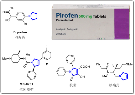 2,5-二氫吡咯衍生物作為一類重要的含氮五元雜環(huán)化合物,其結構廣泛存在于具有生物活性的天然產(chǎn)物及藥物分子中,有著良好的生物活性,例如:抗炎、抗腫瘤、抗菌、鎮(zhèn)痛等(圖1)。由于具有良好的藥理學特性,2,5-二氫吡咯及其衍生物倍受研究人員的關注,因此,發(fā)展簡便高效的2,5-二氫吡咯類化合物合成方法具有重要意義。