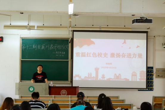 黨委學生工作部副部長鄧俊熙進行第二次授課,以“重溫紅色校史,激揚奮進力量”為題,沿歷史脈絡向同學們介紹了我校自1951年建校以來始終同黨和國家同呼吸共命運的奮斗史,引導同學們深切感受一輩輩校友許黨報國、立德樹人、服務人民的精神追求,激勵廣大學生傳承紅色基因,不斷凝聚奮進力量,從小事做起,堅定不移跟黨走。
