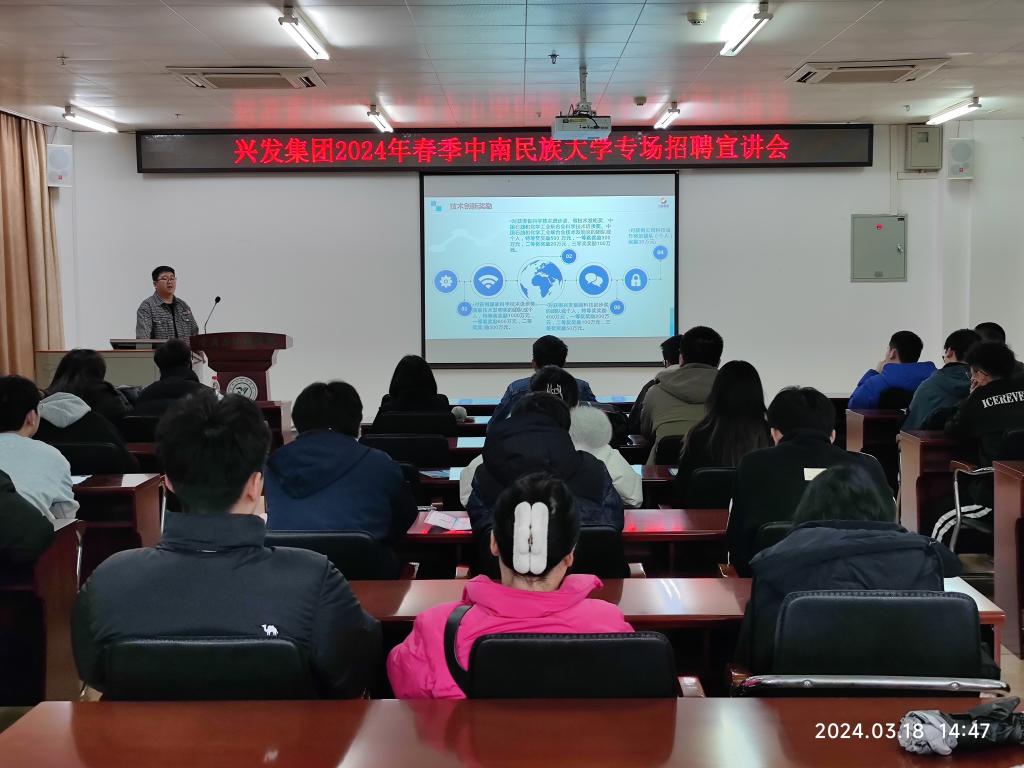 2024年3月18日下午,興發(fā)集團(tuán)2024年春季中南民族大學(xué)專場(chǎng)招聘宣講會(huì)在資源與環(huán)境學(xué)院13棟261會(huì)議室成功舉辦。本次招聘涵蓋了全校工科、理科和文科多個(gè)專業(yè),現(xiàn)場(chǎng)吸引了數(shù)十名應(yīng)屆畢業(yè)生參加。