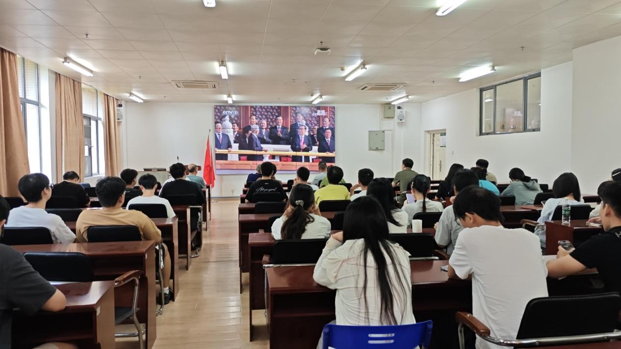 上午9時,閱兵儀式正式開始。學院黨委書記劉子元,黨委副書記、院長孫杰,黨委副書記陳鵬冰,副院長徐志高、葉恒朋、張俊宏等教職工代表,與在校本科生、研究生代表齊聚學院261會議室,通過大屏幕共同收看閱兵直播盛況?,F場氣氛莊嚴肅穆,師生們全神貫注,隨鏡頭回顧中國人民浴血奮戰的抗戰歷程,深切感受新時代中國軍隊的威武雄姿。與此同時,居家同學積極響應,通過電視、網絡直播等渠道同步收看,共赴這一莊嚴時刻。