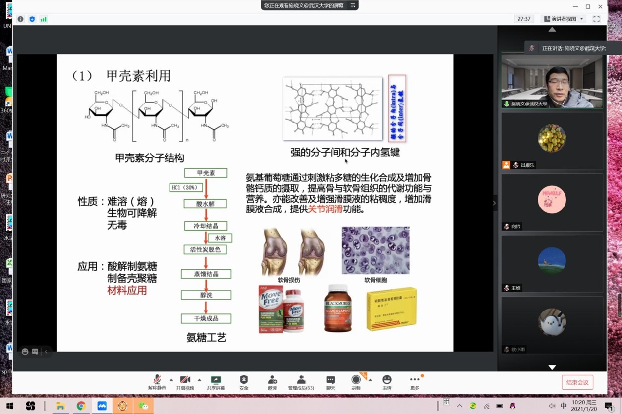 2021年1月20日上午,應我院邀請,武漢大學施曉文教授為我院做題為《甲殼素/殼聚糖資源開發與利用》的線上學術報告。報告由呂康樂教授主持,資環學院和化材學院的60余名師生參加。