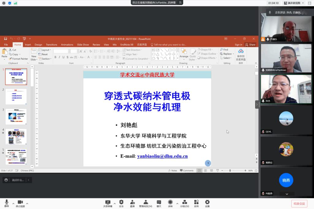 2021年11月4日下午,東華大學(xué)環(huán)境科學(xué)與工程學(xué)院教授劉艷彪老師應(yīng)邀為我院師生做了題為《穿透式碳納米管電極凈水效能與機(jī)理》的線上學(xué)術(shù)講座。學(xué)術(shù)講座由呂康樂副院長主持,多名教師和40余名研究生同學(xué)參加。