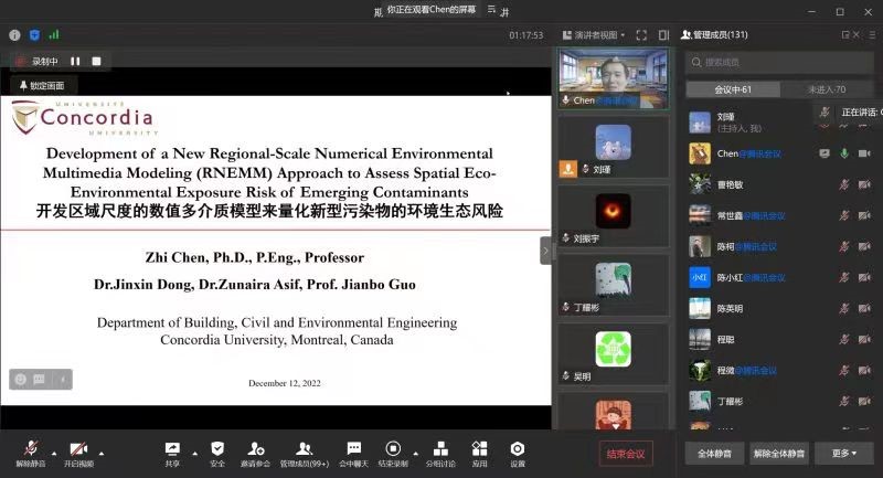 2022年12月12日下午,加拿大康考迪亞大學陳志教授應邀為我院師生做了題為《開發區域尺度的數值多介質模型來量化新型污染物的環境生態風險》的線上學術報告,報告由孫杰教授主持,我院師生積極參加。