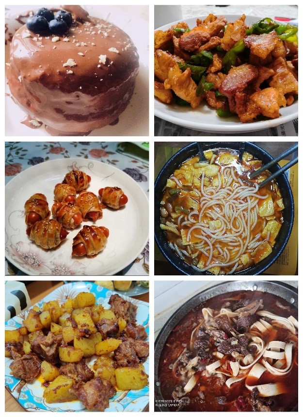 活動開展期間,同學(xué)們每一天堅持美食打卡,以美食傳遞對美好生活的向往和信心。玉溪的米線、川渝地區(qū)的火鍋和北方大饅頭;還有生活在少數(shù)民族地區(qū)的同學(xué)們,更是向大家展現(xiàn)了當(dāng)?shù)靥厣褡屣L(fēng)味的美食,例如回族的燉牛骨頭,土家族的油茶等;同時,網(wǎng)紅菜譜也屢屢登上了同學(xué)們美食榜,自制涼皮、電飯鍋蛋糕、炸油條、手煮奶茶等也刷屏了,同學(xué)們累計打卡556道菜品美食。一場疫情,讓不少同學(xué)解鎖廚藝技能之余,也感受到了廚房、美食的溫暖力量。