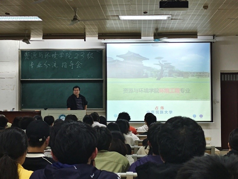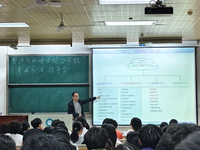 為做好學生專業分流工作,4月11日晚,資源與環境學院2023級專業分流宣講會在11-200室展開。學院黨委副書記藍永麗、副院長張俊宏、各教研室主任、23級班導師和輔導員、環境工程專業優秀學生代表汪嵐玢及23級全體學生參加會議。