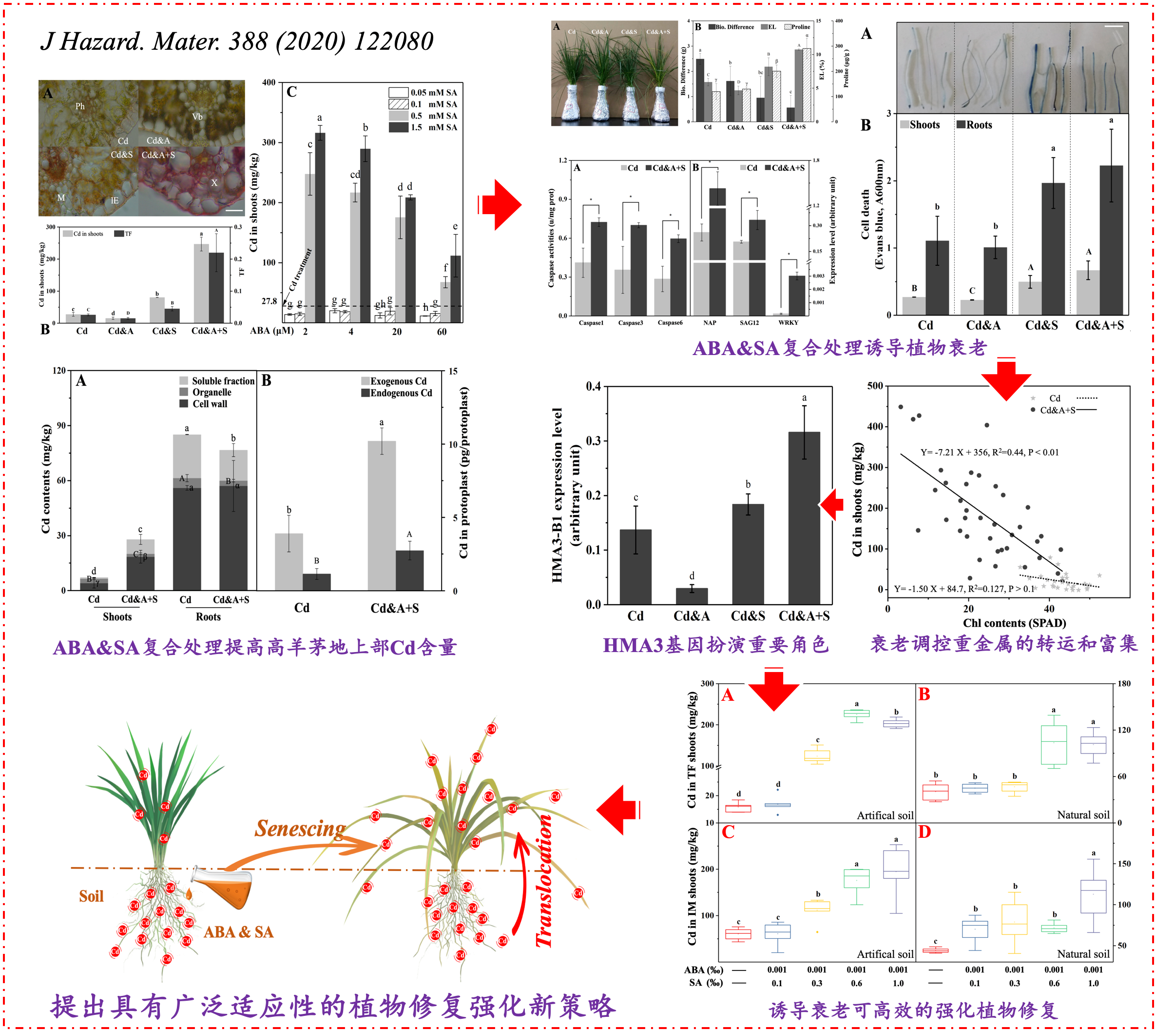 孫杰課題組前期的研究發(fā)現(xiàn),脫落酸(ABA)和水楊酸(SA)的復合處理能大幅提高植物地上部對Cd的富集。深入的研究證實,ABA和SA的復合處理能夠誘導植物衰老,進而調控重金屬在修復植物體內的遷移與分布,提高地上部重金屬的含量,而HMA3基因在這一過程中扮演著重要的作用。孫杰課題組隨后在實驗室內以小盆培養(yǎng)的方式,采用高羊茅和印度芥菜對Cd污染的土壤開展植物修復,并在植物修復的末端施加為期7天的強化處理。相關研究結果表明,額外的7天強化處理措施顯著的提高了高羊茅地上部Cd含量至對照的1.97倍,提高了印度芥菜地上部Cd含量至對照的1.70倍,分別達到69.2μg/盆和27.8μg/盆的水平,證實了這一強化處理措施的可行性。