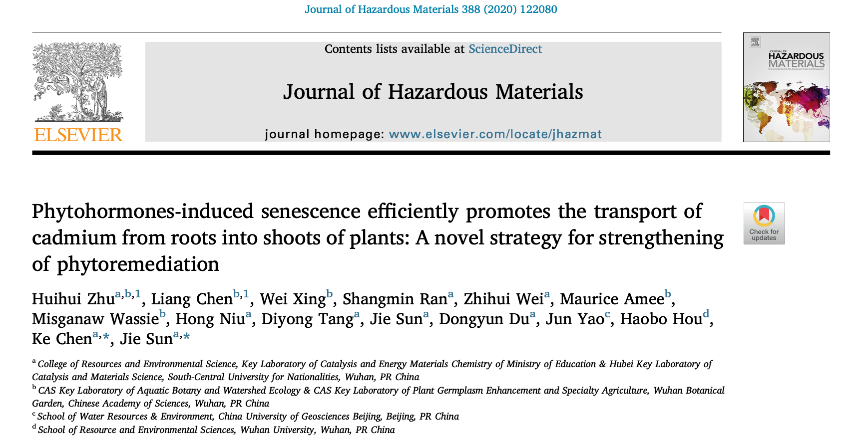 近日,中南民族大學資源與環(huán)境學院環(huán)境修復課題組在Journal of Hazardous Materials(2019年IF=7.65)在線發(fā)表題為“Phytohormones-induced senescence efficiently promotes the transport of cadmium from roots into shoots of plants: A novel strategy for strengthening of phytoremediation”的研究論文,提出了一種具有廣泛適應性的植物修復強化新策略。該校2015級環(huán)境科學專業(yè)的本科生祝慧慧同學為論文第1作者,陳柯副教授和孫杰教授為通訊作者。論文合作單位包括中科院武漢植物園、武漢大學資源與環(huán)境學院和中國地質大學(北京)水資源與環(huán)境學院。