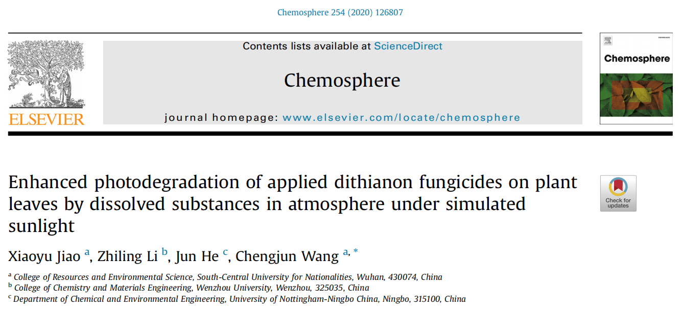 2020年4月,《Chemosphere》在線發表了我院王成俊教授課題組在污染物光化學轉化領域的最新研究成果。該工作探究了植物表面及含有HCO3- / CO32-,NO3-,Fe(Ⅲ)-絡合物及腐殖質類物質空氣飽和溶液中二噻農殺菌劑的光化學轉化,結果表明大氣中具有光活性的溶解性物質可顯著增強農藥的光化學轉化。通過猝滅實驗,電子自旋波譜,激光閃光光解實驗,證明了光致生成的·OH,1O2,CO3·-,3FA*等是促進二噻農殺菌劑光轉化的活性物質。碩士研究生焦嘯宇為該論文的第一作者,王成俊教授為該論文的通訊作者。
