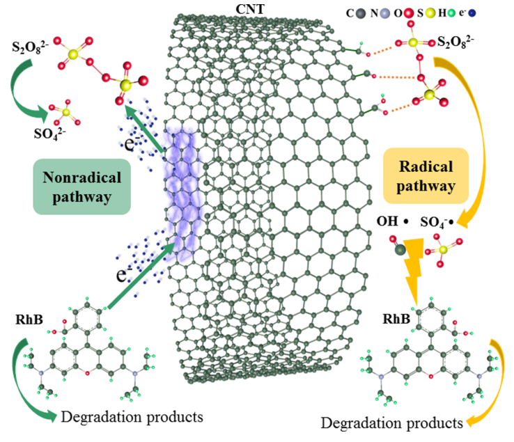 碳納米管(CNTs)作為一種非金屬活化劑,具有比表面積大、穩(wěn)定性好,電子傳輸能力強、邊緣缺陷多等特點,可以高效活化過硫酸鹽(PS),同時可以避免過渡金屬對水體造成二次污染。本文以CNTs活化PS來降解廢水中的RhB。研究發(fā)現(xiàn)在較低PS濃度下,CNTs可以有效活化PS實現(xiàn)RhB的高效降解(20 ppm的RhB在180min可完全降解),并且69.1%的RhB能礦化成CO2和H2O,并且適用pH范圍廣(3-9)。該論文還提出CNT活化PS的活化機理(圖1,自由基機制和非自由基機制共同作用)和RhB的降解機理。