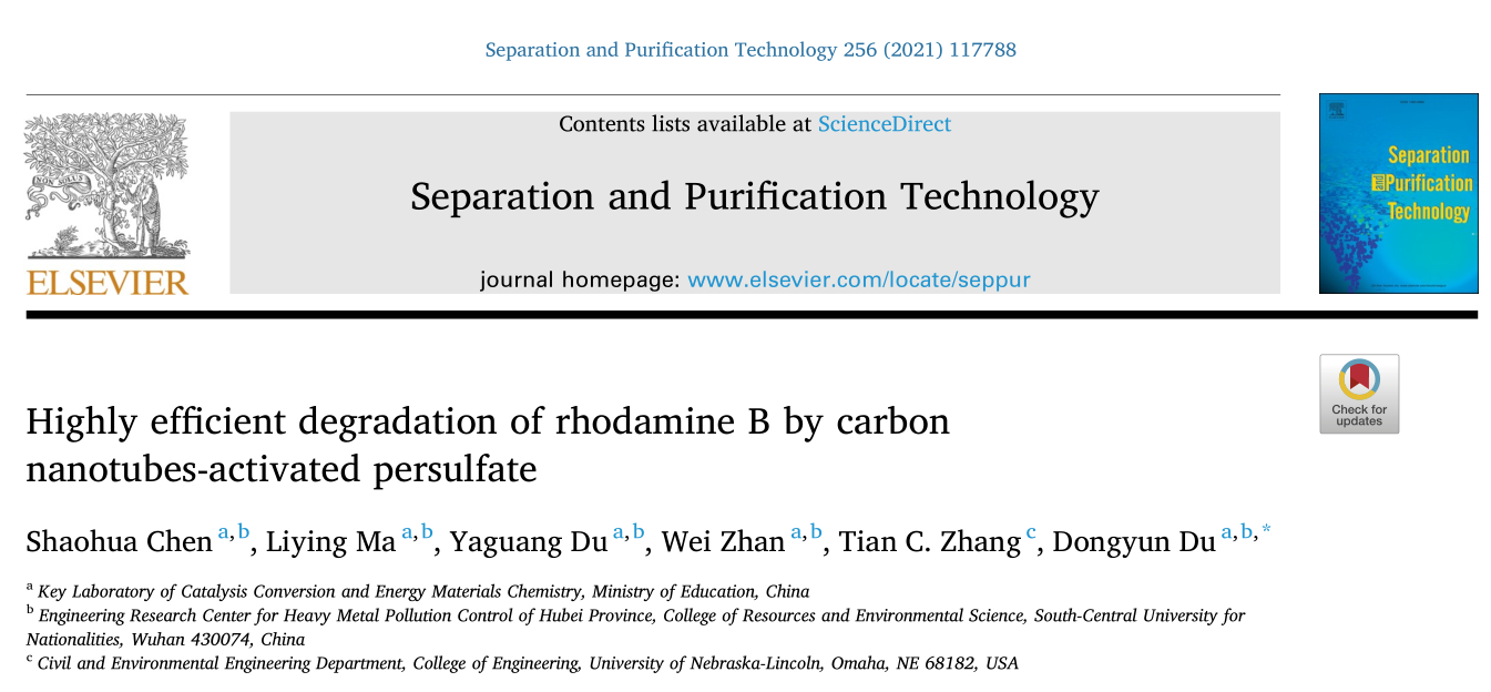 2020年9月25號,我院杜冬云教授團隊在《Separation and Purification Technology》(IF=5.774)發(fā)表了題為《Highly efficient degradation of rhodamine B by carbon nanotubes-activated persulfate》的最新研究成果。陳紹華老師為該論文的第一作者,杜冬云教授為通訊作者。