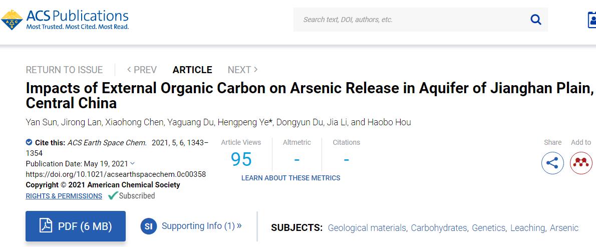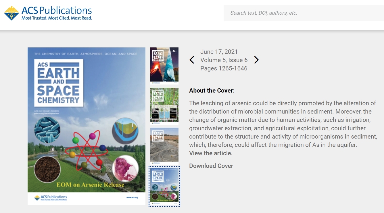 近期,我院杜冬云教授團(tuán)隊(duì)在地球化學(xué)類期刊《ACS Earth and Space Chemistry》發(fā)表了題為《Impacts of external Organic Carbon on Arsenic Release in Aquifer of Jianghan Plain, Central China》的最新研究成果,并被評(píng)選為補(bǔ)充封面論文(Supplementary Cover Article)。研究生孫燕為該論文的第一作者,葉恒朋教授為通訊作者。