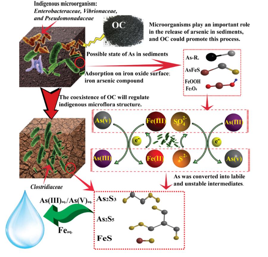 該研究在前期工作基礎(chǔ)上,進(jìn)行野外采樣(湖北江漢平原仙桃市沙湖試驗(yàn)場)、室內(nèi)實(shí)驗(yàn)、測(cè)試分析,著重研究江漢平原地下水系統(tǒng)中不同深度沉積物的砷、鐵、有機(jī)物及微生物的類別進(jìn)行分析、微生物多樣性對(duì)有機(jī)質(zhì)的響應(yīng)、有機(jī)質(zhì)調(diào)控下砷的微生物氧化還原及遷移行為。結(jié)果顯示,外來有機(jī)質(zhì)與土著微生物群落共存時(shí),通過溶解和破壞鐵氧化物生物結(jié)構(gòu)促進(jìn)砷向液相的轉(zhuǎn)移。在此過程中,砷通過有機(jī)質(zhì)的降解轉(zhuǎn)化為不穩(wěn)定的中間體(As2S3,As2S5和AsS)。這些新成果為地下水砷污染防治提供了新的科學(xué)依據(jù)。