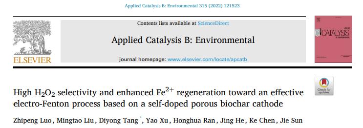 近日,國際知名期刊《Applied Catalysis B: Environmental》發表了我院題為《High H2O2 selectivity and enhanced Fe2+ regeneration toward an effective electro-Fenton process based on a self-doped porous biochar cathode》的研究成果。該研究工作以花生殼生物質為前驅體,利用水熱預處理和熔鹽活化過程制備了自摻雜多孔生物碳(HMC-3),并將其應用作電芬頓技術的陰極材料。論文第一作者為我院研究生羅芝鵬,通訊作者為湯迪勇老師。