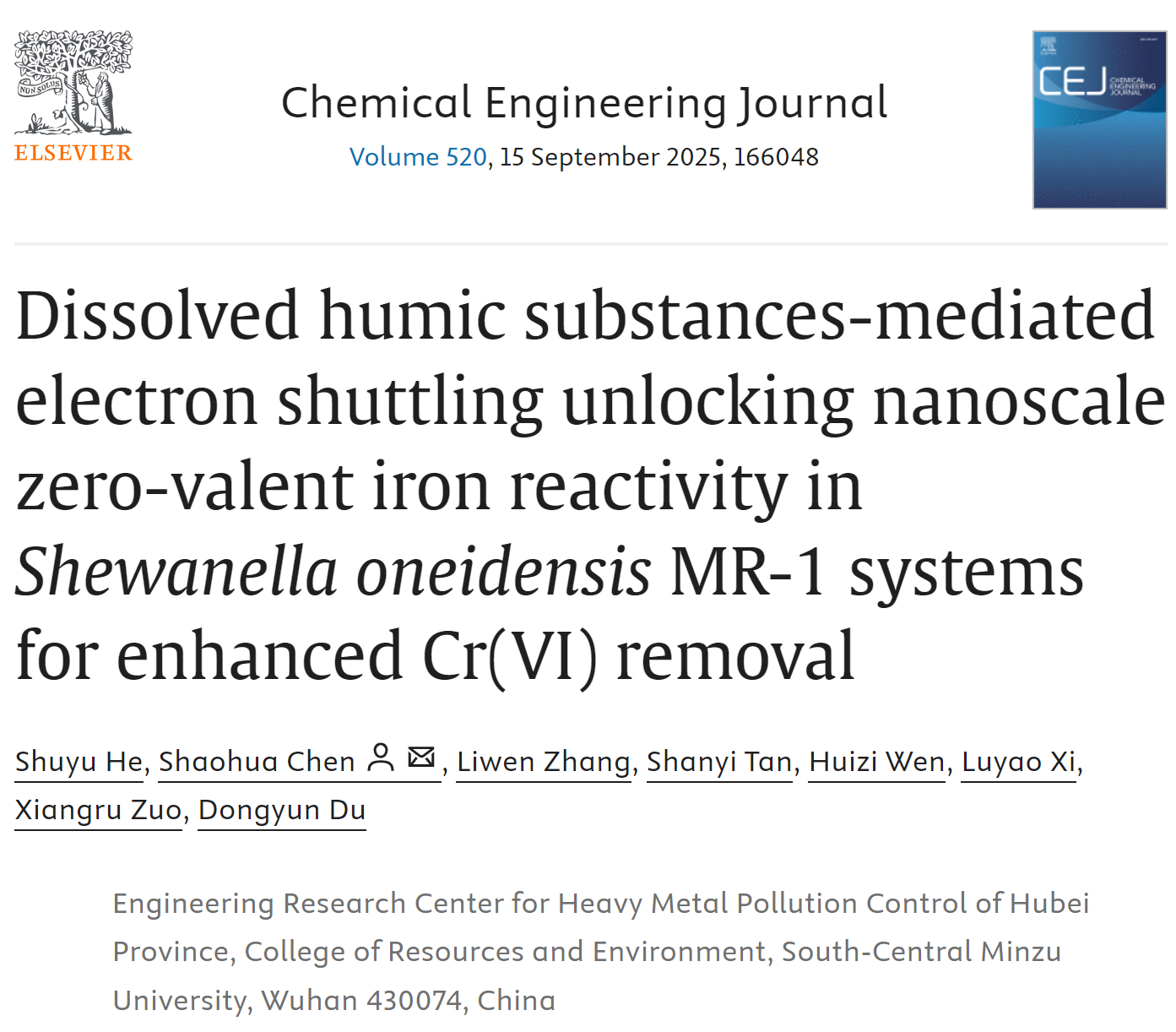 近日,我校杜冬云教授課題組在化工和環境工程領域權威期刊《Chemical Engineering Journal》(中科院一區TOP,IF=13.2)上發表最新研究成果:Dissolved humic substances-mediated electron shuttling unlocking nanoscale zero-valent iron reactivity inShewanella oneidensisMR-1 systems for enhanced Cr(VI) removal,其中我校資環學院碩士研究生何淑玉為論文第一作者,陳紹華副教授為論文通訊作者,中南民族大學為唯一通訊單位。