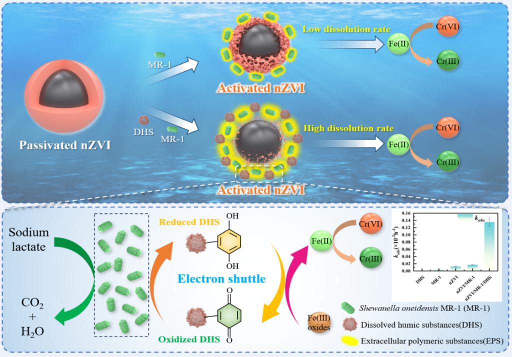 目前主要采用化學法改性nZVI來抑制鈍化層的形成,成本高、易產生二次污染。該研究則采用微生物方法來解決nZVI表面鈍化問題,即基于異化鐵還原菌可利用nZVI表面鈍化層中鐵氧化物為電子受體,將其還原成可溶Fe(II),以此解決nZVI在反應過程中表面鈍化問題,并利用天然環境中的溶解性腐殖質(DHS)為電子穿梭體進一步加速鈍化層溶解,從而長時間維持nZVI的活性。此外,生成的活性Fe(II)是一種較強的還原劑,可以繼續還原Cr(VI),從而實現水體中Cr(VI)的高效、快速去除。同時研究還構建了DHS的分子結構和Cr(VI)去除速率常數之間的定量關系。這項研究提出一種高效、低成本、環境友好解決nZVI表面鈍化層的新方法,應用前景廣闊。該技術通過微生物方法解決nZVI在實際應用過程中易鈍化的瓶頸問題,為推動nZVI修復技術的大規模應用奠定基礎。