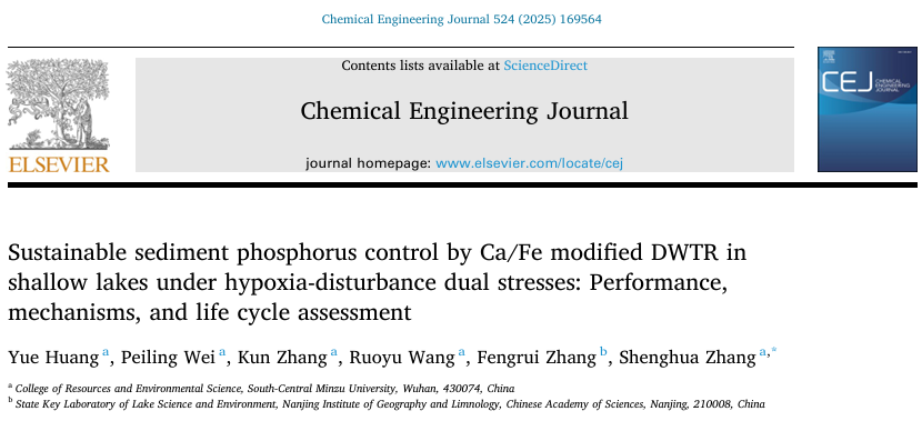 近日,我院張勝花教授課題組在化工和環境工程領域權威期刊《Chemical Engineering Journal》(中科院一區TOP,IF=13.2)上發表題為“Sustainable sediment phosphorus control by Ca/Fe modified DWTR in shallow lakes under hypoxia-disturbance dual stresses: Performance, mechanisms, and life cycle assessment”的最新研究成果。第一作者為我校資環學院碩士研究生黃悅,論文通訊作者為張勝花教授,中南民族大學為唯一通訊單位。