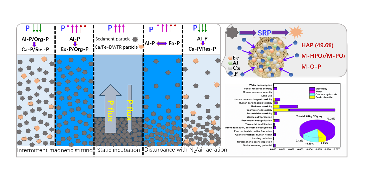 本研究通過共沉淀法制備了Ca/Fe-DWTR,最大吸附容量達82.24 mg P/g。其吸附性能受pH值、共存離子和腐殖酸的影響極小,在廣泛的水環境條件下均能保持穩定的除磷效果,解決了傳統材料適應性差的關鍵問題。借助TEM-EDS、XRD、XPS多種表征技術揭示了Ca/Fe-DWTR的磷吸附機制:通過形成羥基磷灰石、金屬-磷酸氫鹽/磷酸鹽沉淀以及內層金屬-氧-磷絡合物實現磷的高效固定,吸附后的磷主要以穩定的鈣結合態形式存在,顯著降低了磷的二次釋放風險。Ca/Fe-DWTR通過將不穩定的磷形態(如鋁結合態磷、有機磷)轉化為穩定的鈣結合態磷和殘渣態磷有效抑制沉積物磷釋放。生命周期評估結果表明,Ca/Fe-DWTR制備過程的環境影響較小,該材料以工業副產物為原料,既實現了廢棄物的資源化利用,又降低了制備成本,在缺氧及頻繁擾動的淺水湖泊富營養化沉積物修復中具有顯著應用潛力。
