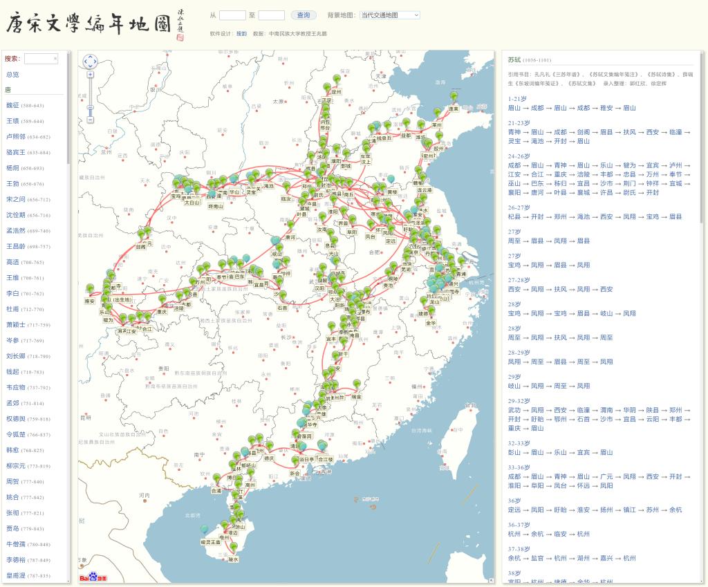 王兆鵬教授領銜的團隊與搜韻合作開發的唐宋文學編年地圖之蘇軾的人生軌跡。學院供圖